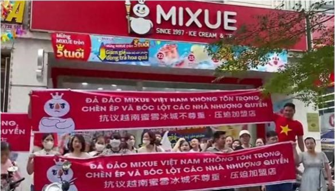 比如去年9月,蜜雪冰城的越南加盟商集體拉橫幅集體抗議。起因是蜜雪冰城宣布在越南產(chǎn)品降價(jià)25%,但供應(yīng)給加盟商的原料卻只降低8%-10%,這意味著加盟商需要承擔(dān)較大的調(diào)價(jià)損失。