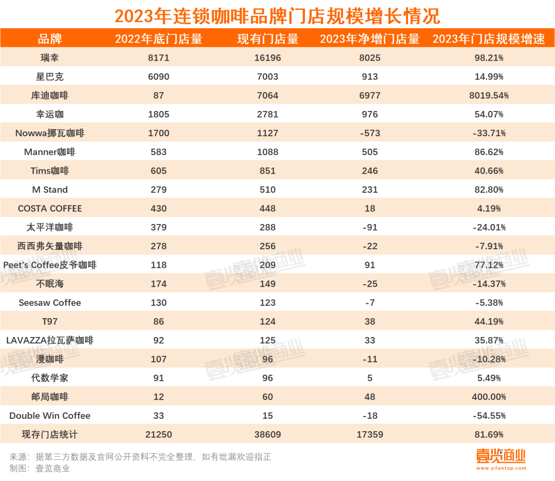 從門店數(shù)量看,壹覽商業(yè)長(zhǎng)期追蹤的連鎖咖啡品牌從2022年底的21250家門店擴(kuò)張至2023年底的38609家門店,增速高達(dá)81.69%,其中又以庫迪為最——一年新開門店近7千家,增速超8000%。不少品牌有樣學(xué)樣,開始拓展商業(yè)版圖。