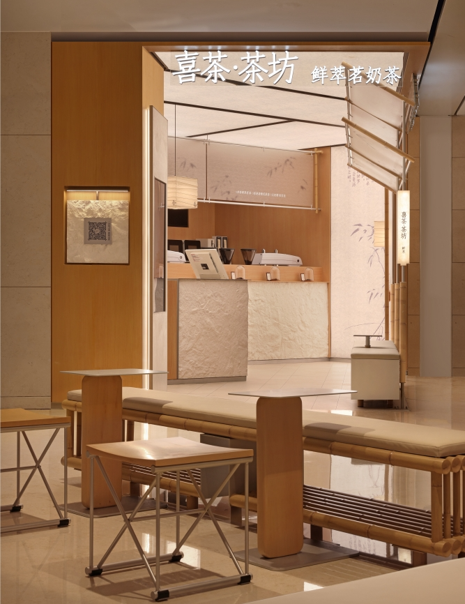 設(shè)計(jì)風(fēng)格方面,貼合茶坊概念,汲取宋朝茶坊山居、竹間的靈感,采用現(xiàn)代東方極簡(jiǎn)設(shè)計(jì),塑造一個(gè)頗具氛圍感、宜古宜今的茶坊空間。茶文化體驗(yàn)區(qū)分布在取餐臺(tái)外側(cè)等位置,有效利用空間展示門店多款茶底,還包括產(chǎn)地、特點(diǎn)等科普內(nèi)容。