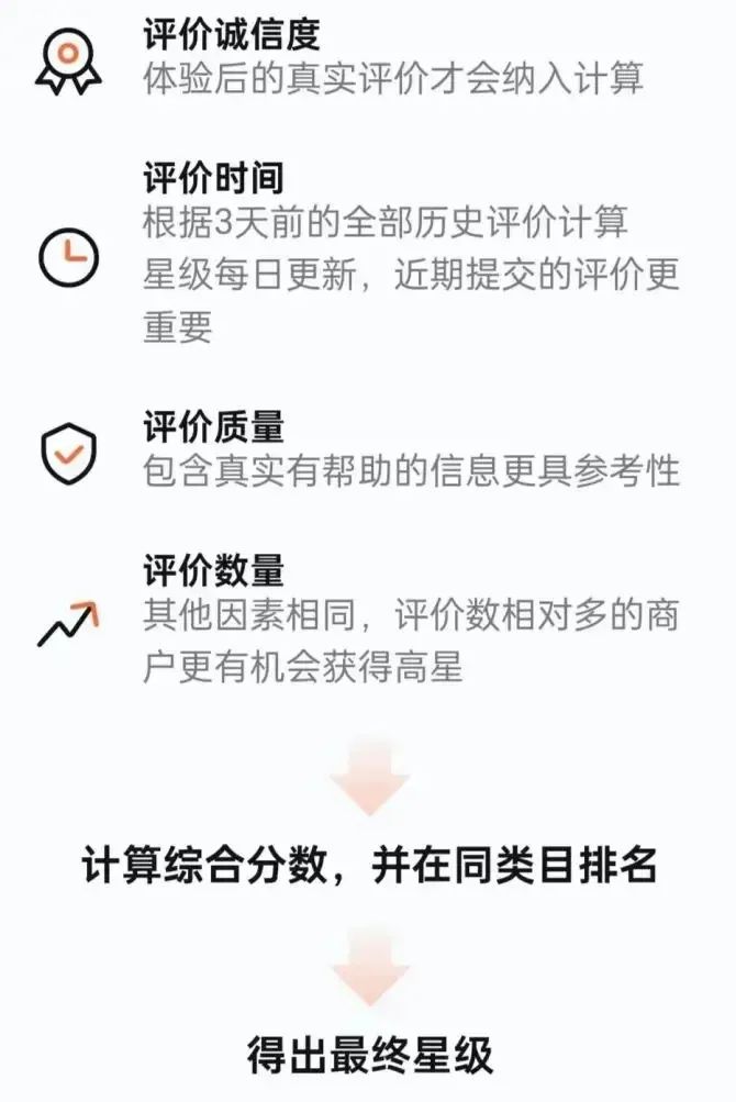 除了綜合參考多種評定標準的星級模型,搜索后的排序展示也是多維因素影響下的結果,二者相結合,在規(guī)則上最大程度確保了平臺對商戶評級的客觀、全面和公正。