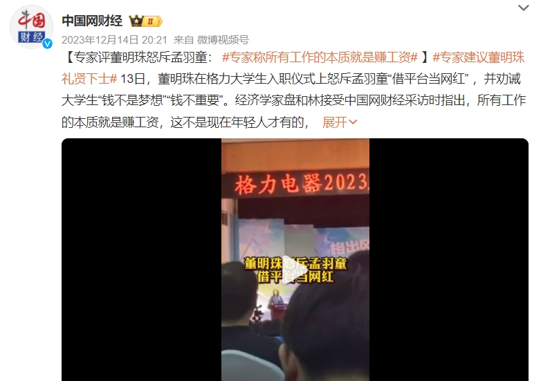 直到12月份,董明珠在格力電器2023屆大學(xué)生入職儀式中發(fā)言,并以孟羽童為負面案例,批評其做不好秘書本職工作,稱其只是“借助我們平臺變成一個網(wǎng)紅,不能容忍這樣的人在格力,所以把她開除了”。