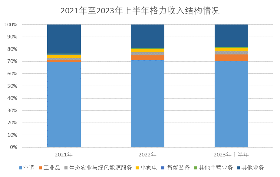 資深家電行業(yè)分析師劉步塵認為:格力的多元化轉(zhuǎn)型在2010年之前已經(jīng)開始,但到2023年上半年為止,空調(diào)之外的產(chǎn)品對格力電器的營收貢獻率不到10%,經(jīng)營業(yè)績?nèi)愿叨纫蕾嚳照{(diào)業(yè)務(wù),一定程度上折射出格力多元化并不成功。