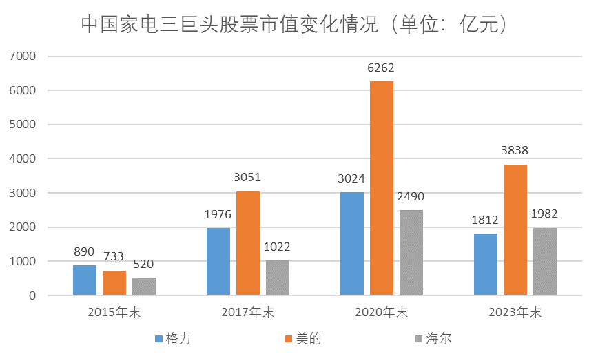 先從股票市值變化情況來看。2015年末,格力電器的股票市值還高于美的集團(000333.SZ)和海爾智家(600690.SH),在三巨頭中排名第一;到了2017年末,格力股票市值就已經(jīng)美的趕超。此后,格力與美的股票市值差距越拉越大,同時海爾股票市值在加速追趕;到了2023年末,格力股票市值被海爾反超,在三巨頭中排名墊底。