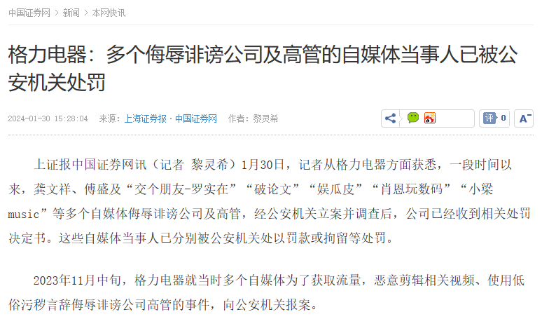 對于該“緋聞”,董明珠多次公開辟謠但效果甚微;為此,格力電器選擇直接向公安報案。1月30日,據(jù)媒體報道,包括龔文祥、傅盛及“交個朋友-羅實在”等在內(nèi)的多個自媒體,因侮辱誹謗格力電器及公司高管,被公安機關(guān)處以罰款或拘留等處罰。自此,該事情暫告一段落。