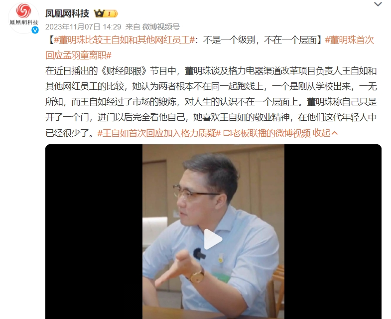先是與“未來接班人”孟羽童的“愛恨情仇”被熱炒。2023上半年,孟羽童在社交媒體上發(fā)布視頻稱其已經(jīng)從格力電器離職,未來將會繼續(xù)讀書深造。然后網(wǎng)友們開始揣測“真實內(nèi)幕”:有網(wǎng)友稱孟羽童離職是為了去做直播、變現(xiàn)流量,不過被其否認;也有自媒體爆料稱孟羽童是被格力開除而并非主動離職。