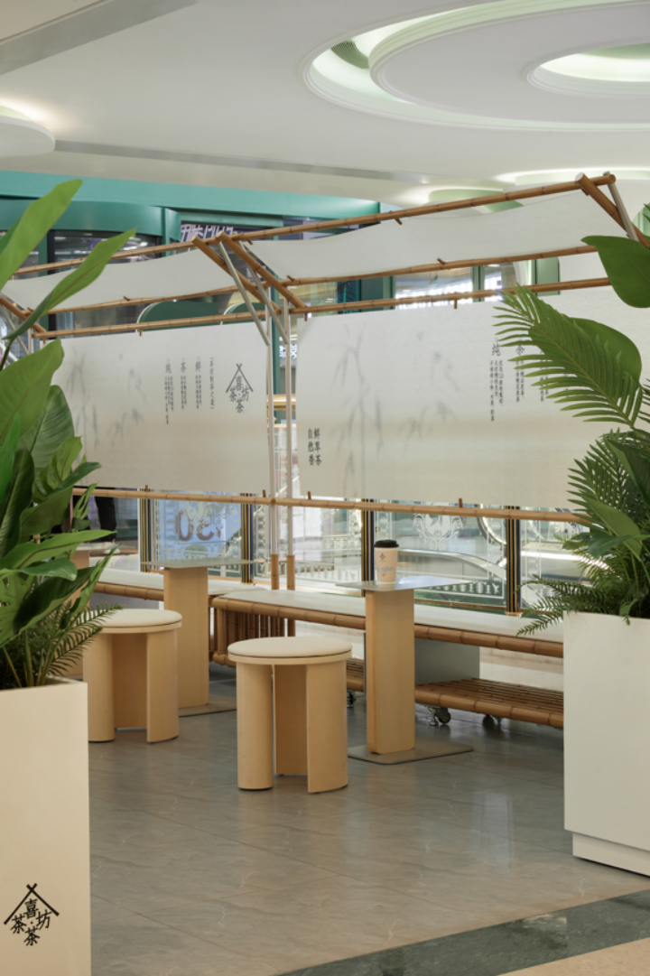 在門店空間設(shè)計(jì)上,位于環(huán)球港商場(chǎng)的上海喜茶·茶坊,融入了長(zhǎng)廊、竹亭、山水等宋朝茶坊元素,結(jié)合豐富的外擺空間,在繁忙的都市中營(yíng)造出竹間飲茶,“偷得浮生半日閑”的悠然意境。