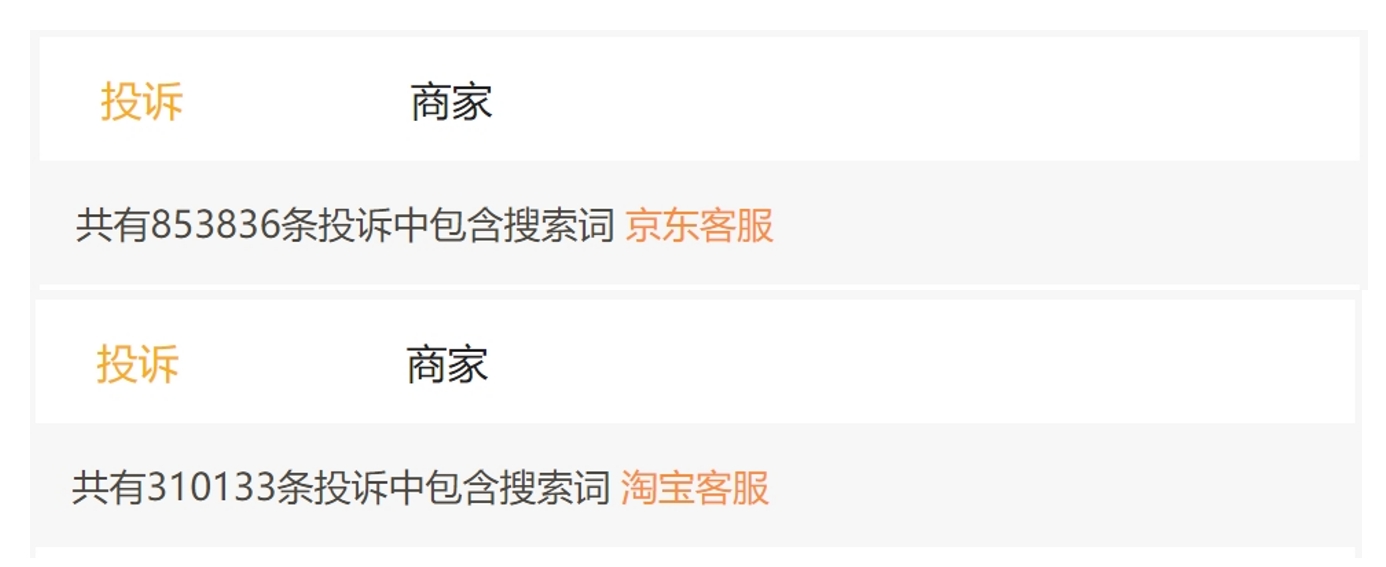 稍微翻閱各大社交網(wǎng)站,就能找到用戶對(duì)電商平臺(tái)客服的各種吐槽。在黑貓投訴平臺(tái)上搜索關(guān)鍵詞“淘寶客服”,則能看到超過(guò)31萬(wàn)條相關(guān)投訴,“京東客服”的搜索結(jié)果更是達(dá)到驚人的85萬(wàn)條,投訴內(nèi)容也可以說(shuō)是五花八門。