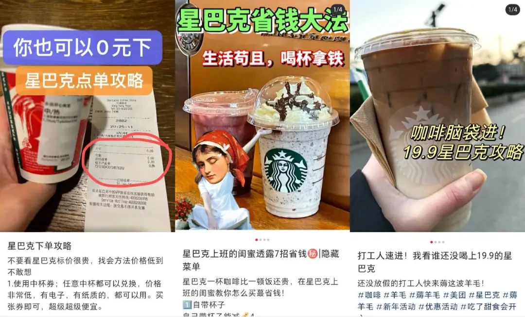 星巴克四季度財報中顯示,在整體收入在增長、同店銷售額在增長的情況下,平均客單價同比下滑3%。銷售量、交易量雙漲,客單下滑,這些數(shù)據(jù)告訴我們,星巴克的消費者數(shù)量增加,但人們在星巴克花的錢變少了。最直觀的體現(xiàn)是在各大生活服務(wù)類平臺上,可以買到19.9元一杯的星巴克了。
