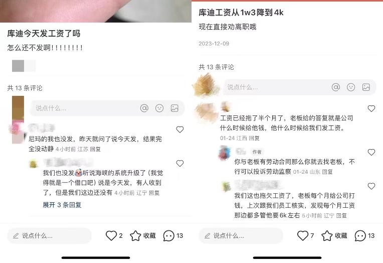 小紅書、抖音等各大平臺(tái),隨便一搜,聯(lián)營(yíng)商對(duì)庫(kù)迪的吐槽已經(jīng)多如牛毛。比如兩個(gè)聯(lián)營(yíng)商寫了兩封公開信,再比如有前員工爆料其所在門店存在物品混用、偷工減料等問題。近期又有不少庫(kù)迪員工在小紅書上爆料,揭露了庫(kù)迪發(fā)工資不及時(shí),以及降薪、拖欠工資等情況......