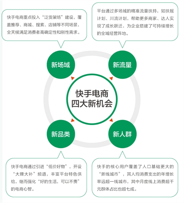 在新人群上,快手電商基于在新線城市中的核心用戶群體優(yōu)勢(shì),形成差異化用戶人群特征,結(jié)合高信任度、高粘性的半熟人社區(qū)特點(diǎn),為經(jīng)營(yíng)者提供高消費(fèi)活力的新增量市場(chǎng)。