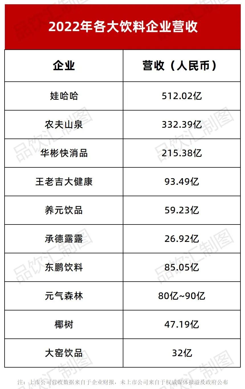 而2022年東鵬飲料營收85.01億,農(nóng)夫山泉營收332.39億,華彬快消品包含紅牛、戰(zhàn)馬、VOSS在內(nèi)的整體營收215.38億元,依托氣泡水一炮而紅的元氣森林預(yù)計營收為80億元~90億元之間。