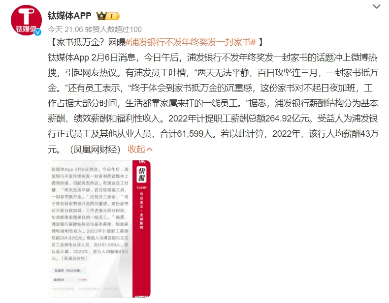 同樣被“噴”上熱搜的還有浦發(fā)銀行(600000.SH),原因是有自稱浦發(fā)銀行員工的網(wǎng)友吐槽,稱公司過年沒發(fā)年終獎,而是發(fā)了一封家書,“家書抵萬金”。不過浦發(fā)銀行也回應(yīng)稱,所謂家書是給員工家屬的慰問信,隨信發(fā)放的還有2000元慰問金,而年終獎和慰問金不是一個性質(zhì)的錢,年終獎的本質(zhì)是績效獎金。