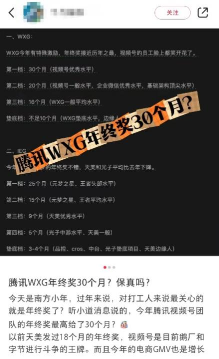 近日,一張騰訊WXG(微信事業(yè)群)年終激勵的截圖在社交平臺廣泛流傳。其中顯示,WXG年終獎接近歷年之最,視頻號員工臉上笑開了花,績效第一檔員工能獲得30個月月薪的年終獎。