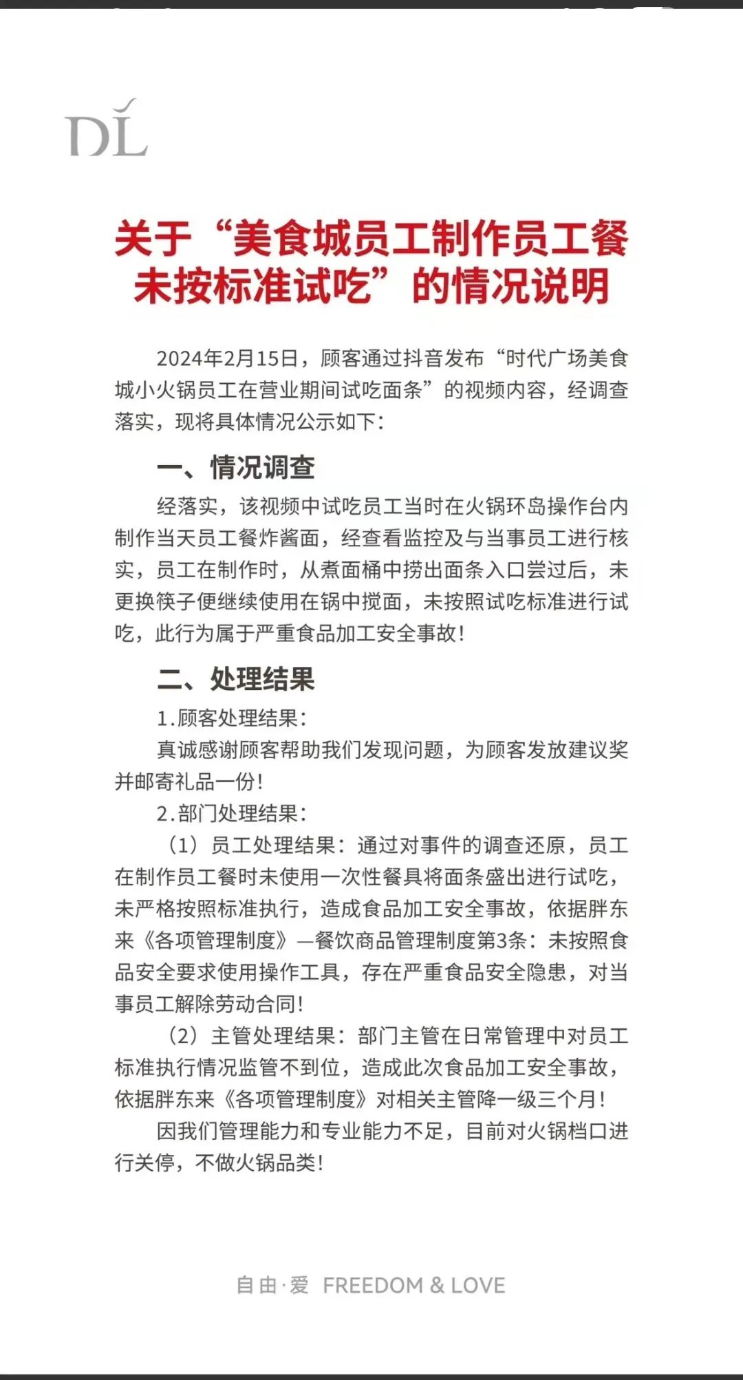 (1)員工處理結(jié)果:通過對(duì)事件的調(diào)查還原,員工在制作員工餐時(shí)未使用一次性餐具將面條盛出進(jìn)行試吃,未嚴(yán)格按照標(biāo)準(zhǔn)執(zhí)行,造成食品加工安全事故,依據(jù)胖東來《各項(xiàng)管理制度》—餐飲商品管理制度第3條:未按照食品安全要求使用操作工具,存在嚴(yán)重食品安全隱患,對(duì)當(dāng)事員工解除勞動(dòng)合同!
