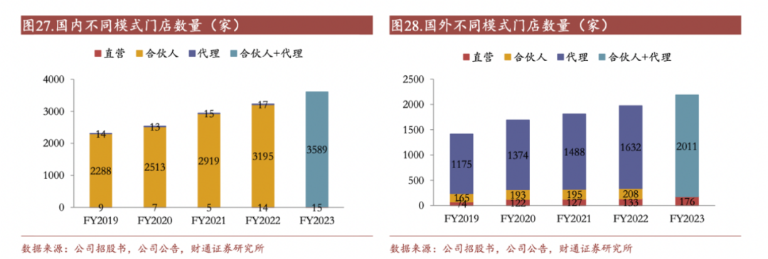 海外主要的門(mén)店模式主要是「貨品買(mǎi)斷制」模式,合伙人、直營(yíng)店模式為輔。名創(chuàng)優(yōu)品對(duì)代理商的運(yùn)營(yíng)參與程度較小,體現(xiàn)為不提供管理和咨詢服務(wù),且代理商以買(mǎi)斷的形式進(jìn)貨,銷(xiāo)售利潤(rùn)的大頭為代理商所得,庫(kù)存的風(fēng)險(xiǎn)也由代理商來(lái)承擔(dān)。