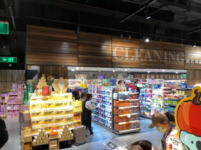 號(hào)稱斥資上百萬(wàn)的洗手間里,水龍頭都是戴森洗吹一體的款式,洗手臺(tái)上放著棉簽、護(hù)手霜、發(fā)卡、小梳子,還貼心地準(zhǔn)備了女性用品。類似的細(xì)節(jié)還有很多,比如說(shuō)橙子旁邊放著剝皮器,飲料、醬油醋、熟食等產(chǎn)品旁邊配有放大鏡,冷凍柜上面掛著防低溫硅膠手套,塑料袋為了拿取方便,配了濕手器。