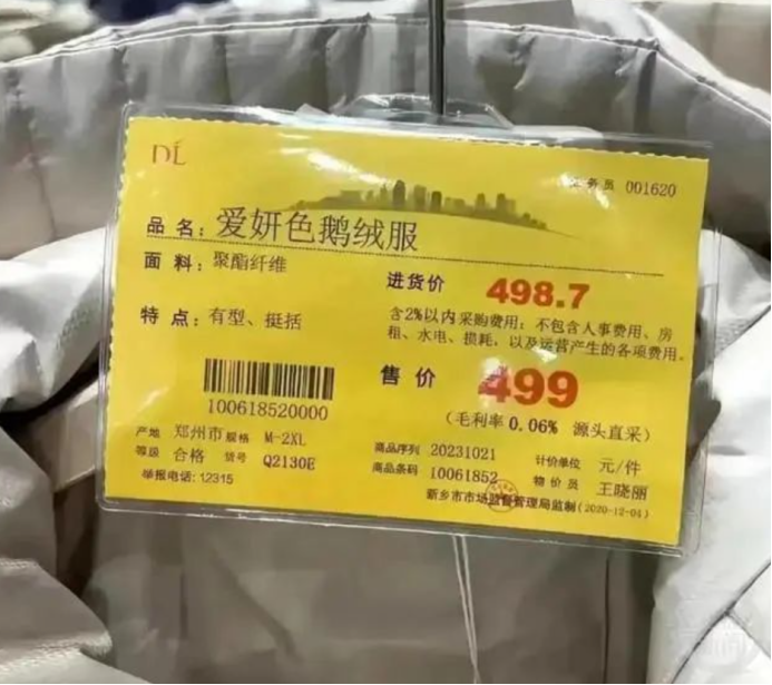 從前兩年開(kāi)始,胖東來(lái)對(duì)部分產(chǎn)品價(jià)簽進(jìn)行了調(diào)整,一些服飾鞋帽產(chǎn)品、水果等產(chǎn)品,都標(biāo)上了進(jìn)貨價(jià)。前段時(shí)間,有網(wǎng)友曬出胖東來(lái)的一張羽絨服標(biāo)價(jià)圖片,上面明確寫著進(jìn)貨價(jià)498.7元,售價(jià)499元,算下來(lái)一件的利潤(rùn)只有0.3元。當(dāng)時(shí)胖東來(lái)回應(yīng),這屬于促銷讓利商品,胖東來(lái)一直在服裝方面讓利比較大。