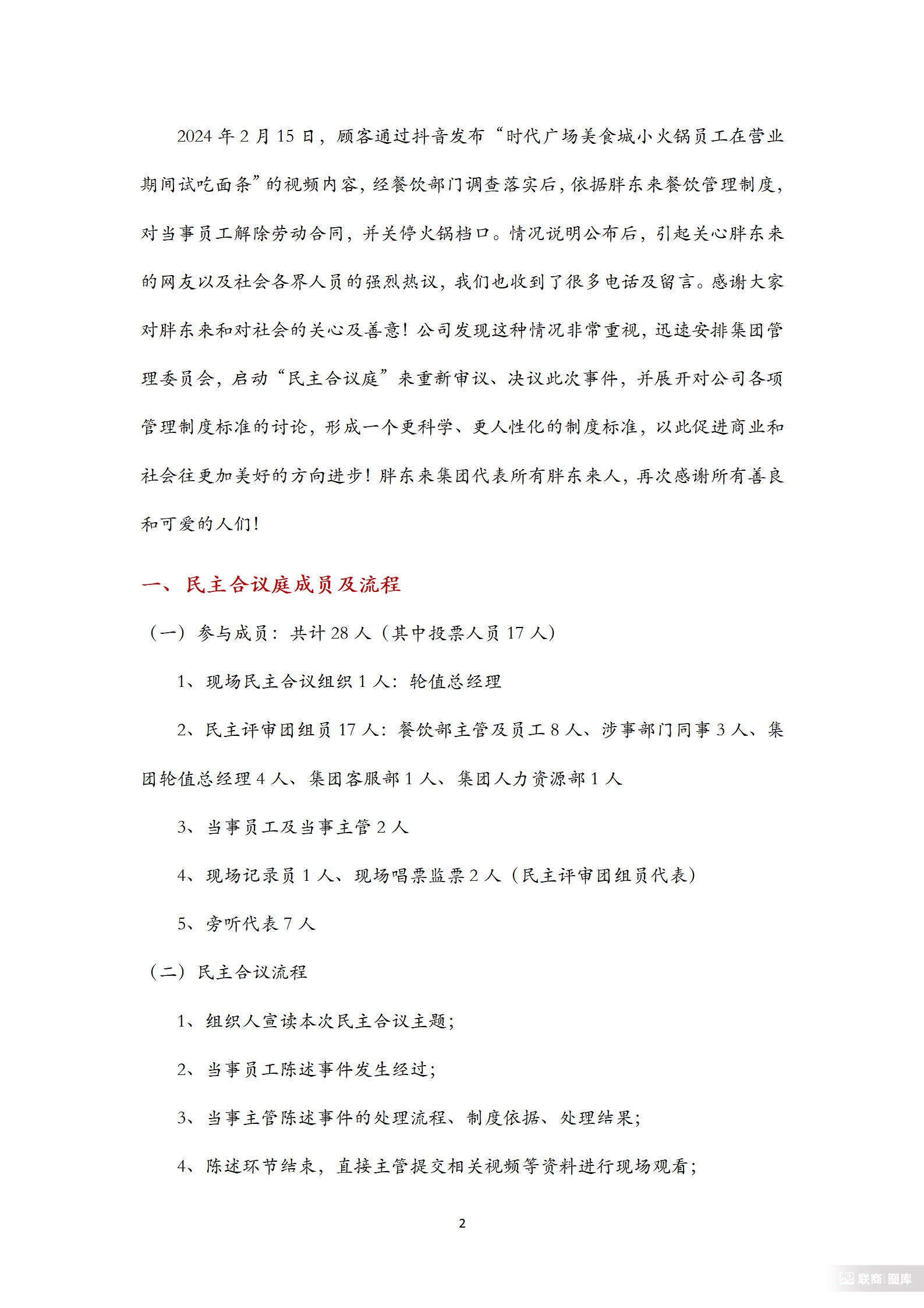 此事件源于2月15日,顧客通過抖音發(fā)布了“時代廣場美食城小火鍋員工在營業(yè)期間試吃面條”的視頻內(nèi)容,該事件隨即沖上熱搜,引發(fā)網(wǎng)友熱議。2月16日,胖東來經(jīng)調(diào)查落實后公布了情況說明和處理結(jié)果:對當(dāng)事員工解除勞動合同,對相關(guān)主管降一級三個月,并關(guān)停火鍋檔口。