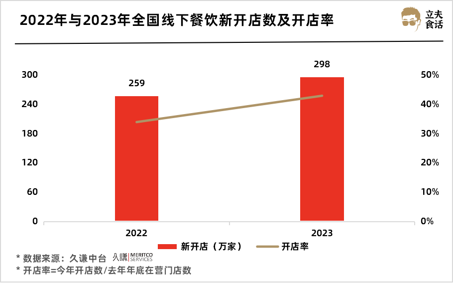 2023年全國新開餐飲門店數(shù)高達(dá)298萬家,開店率達(dá)到43%。