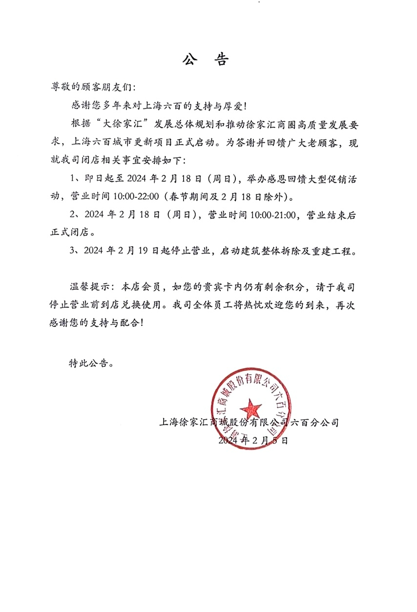2月5日,上海六百發(fā)布公告稱,“根據(jù)“大徐家匯”發(fā)展總體規(guī)劃和推動徐家匯商圈高質(zhì)量發(fā)展要求,上海六百城市更新項(xiàng)目正式啟動”,同時預(yù)告,從即日起至18日,舉辦感恩回饋大型促銷活動;2月19日起正式停止?fàn)I業(yè),并啟動建筑整體拆除及重建工程。