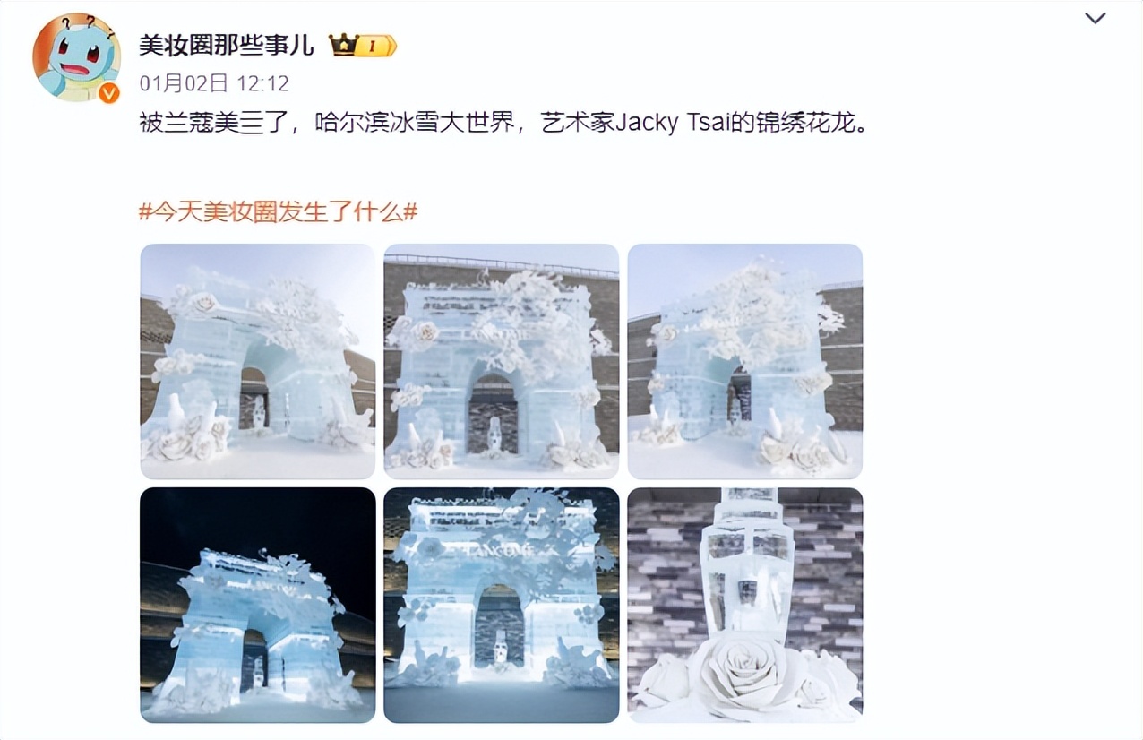 今年比較“出圈”的就是蘭蔻在哈爾濱冰雪大世界,與藝術(shù)家Jacky Tsai合作展出的錦繡花龍藝術(shù)冰雕裝置;整個(gè)雕塑融合了巴黎凱旋門元素以及中國(guó)的龍年元素,圍繞著蘭蔻小黑瓶做延展設(shè)計(jì)。