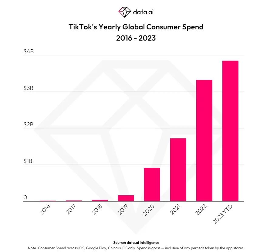 具體來看,抖音國際版TikTok位居第一,YouTube位居第二。據(jù)統(tǒng)計(jì),2023年抖音用戶付費(fèi)額約為2020年的4.5倍。