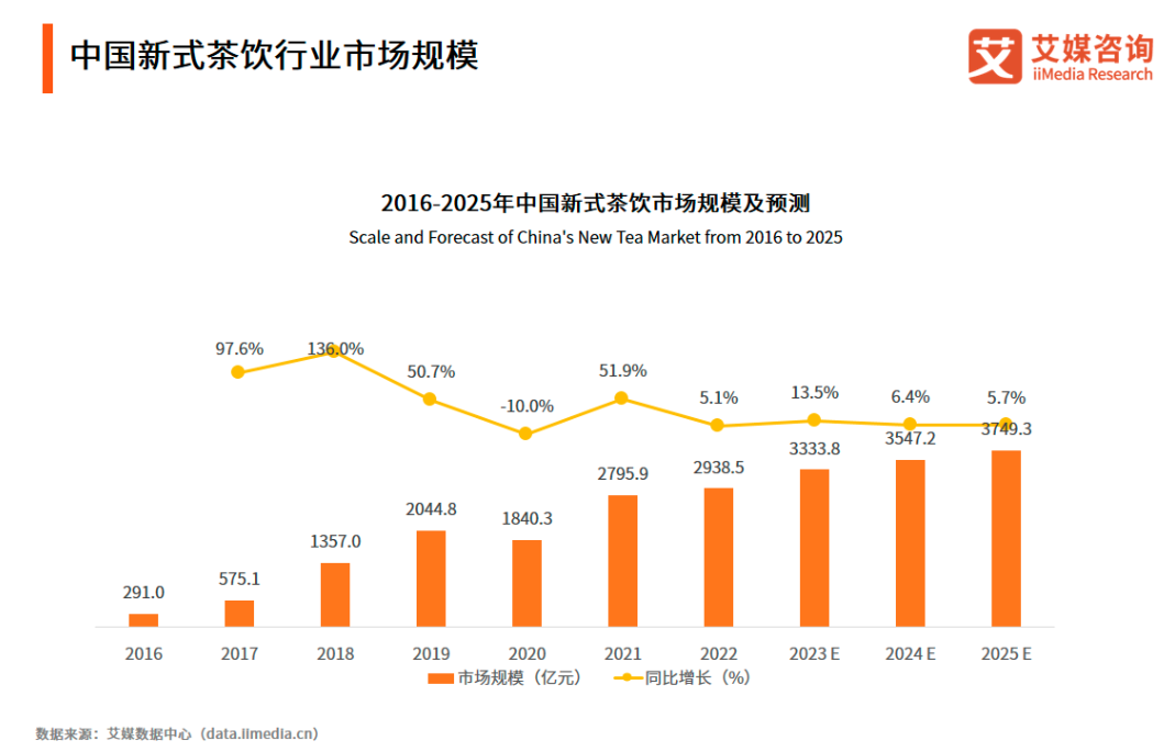 根據(jù)艾媒咨詢數(shù)據(jù)顯示,2022年我國新茶飲市場規(guī)模為2938.5億,預(yù)計(jì)到2025年這一數(shù)字將會變成3749.3億。不過需要注意的是,增速正變得肉眼可見的下滑,未來兩年市場規(guī)模同比增長只有6%左右,這也預(yù)示著整個新茶飲賽道已經(jīng)開始從曾經(jīng)的增量市場轉(zhuǎn)變?yōu)榇媪渴袌觥?/p>