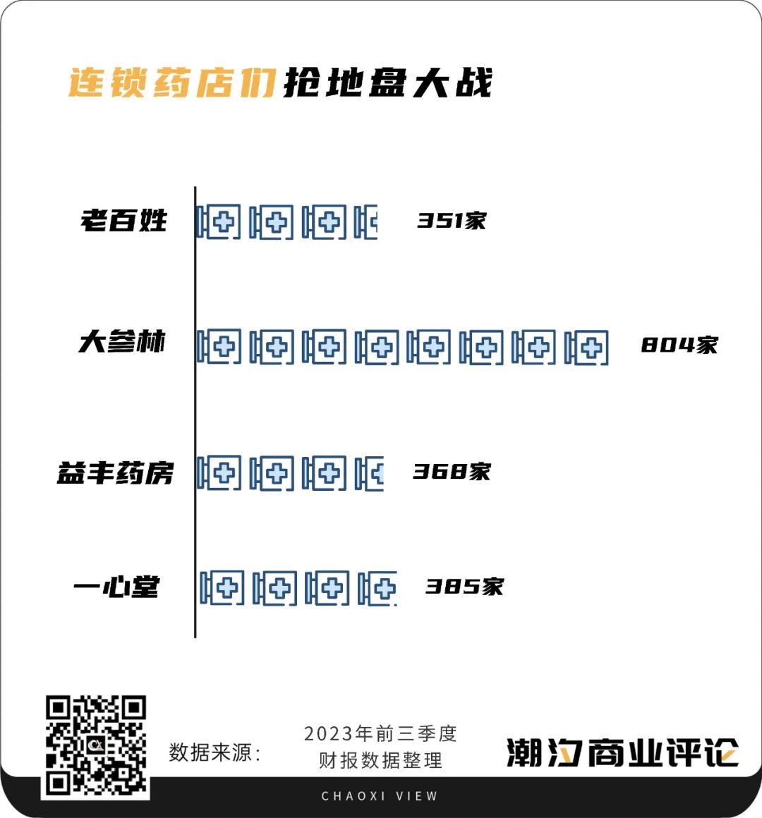 數(shù)據(jù)顯示,截至2023年三季度末,四大上市連鎖藥房老百姓、大參林、益豐藥房和一心堂的門店數(shù)量分別為13065家、12993家、12350家、10008家。