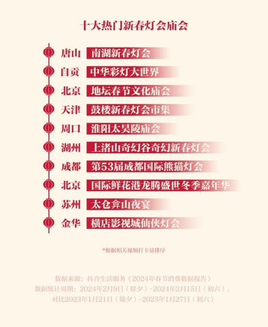 據(jù)抖音生活服務(wù)發(fā)布:唐山南湖新春燈會、自貢中華彩燈大世界、北京地壇春節(jié)文化廟會為抖音網(wǎng)友最熱衷打卡的三大新春燈會廟會;成都的國際熊貓燈會、融合傳統(tǒng)仙俠文化和影視IP的橫店仙俠燈會等獨具地方特色的燈會,也受到人們追捧;北京故宮博物院、國家博物館、四川三星堆博物館等客流保持高位,多地文博場館圍繞龍年主題開展了豐富多彩的活動。