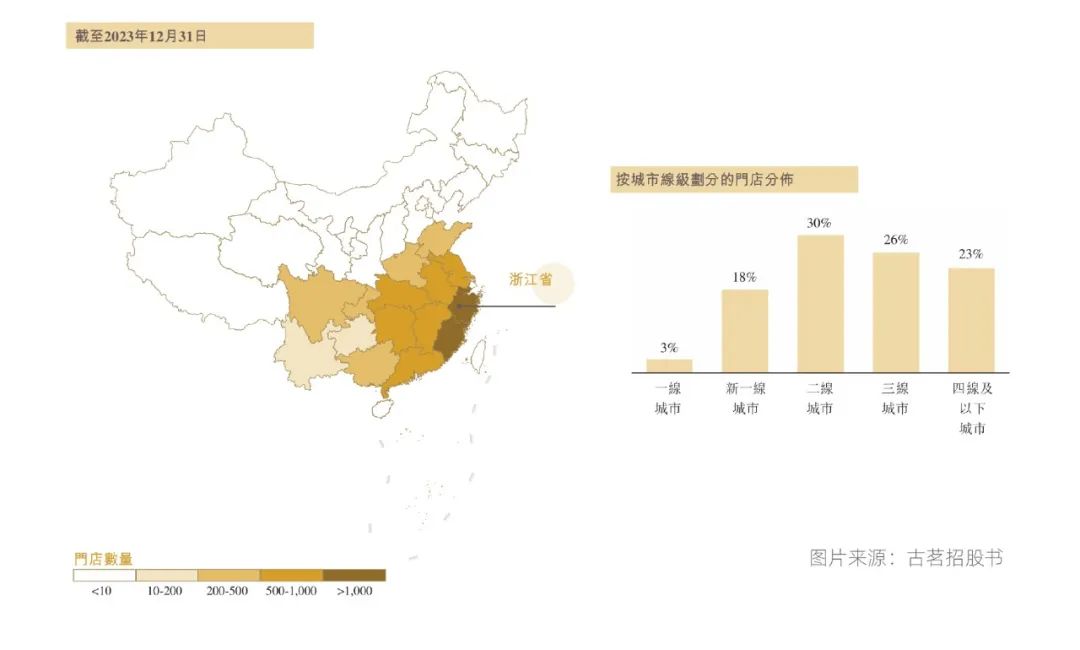 古茗有近乎8成的門店位于二線及以下城市,和蜜雪冰城一起印證了下沉市場的消費潛力。直至目前,古茗仍然未在上海和北京開店,這也是其一線城市只有3%門店的原因之一。