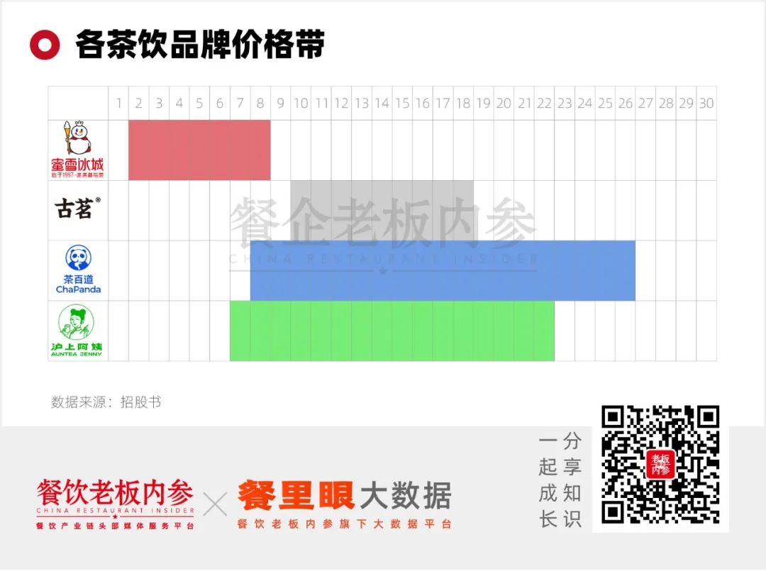 蜜雪冰城的價格定價在2-9元之間,其最受歡迎的兩款產(chǎn)品冰鮮檸檬水和珍珠奶茶的定價分別為4元和2元。古茗的定價在10-18元之間,滬上阿姨的定價在7-22元之間?缍茸畲蟮氖遣璋俚,定價范圍在8到26元之間。