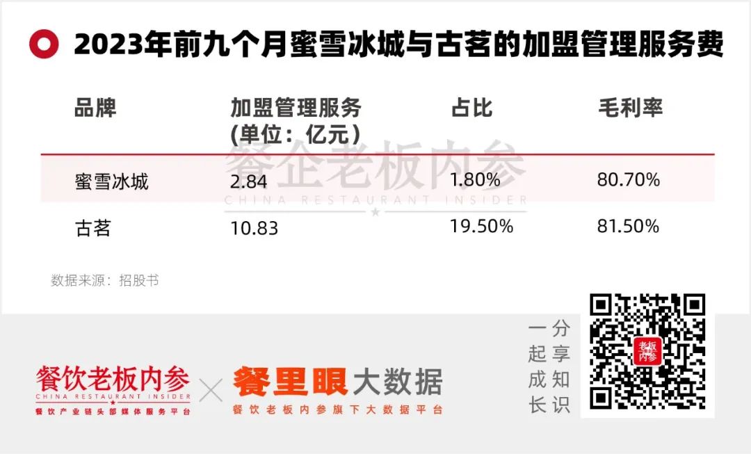 拿蜜雪冰城和古茗來看,蜜雪冰城“加盟和相關(guān)服務(wù)”收入為2.48億,占比為1.8%。古茗“加盟管理服務(wù)”收入為10.83億元,占比為19.5%。這筆收入遠高于蜜雪冰城,同時相當于古茗前九個月的凈利潤。