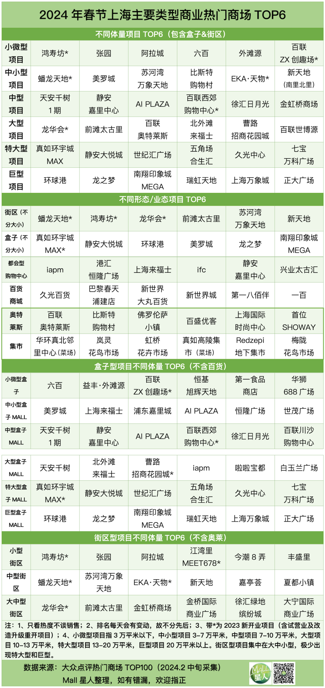 這部分先基于不同體量/類型的視角,看看熱門商場(chǎng)TOP6頂流都有哪些身影,見下表——TOP6基于大眾點(diǎn)評(píng)春節(jié)期間熱門商場(chǎng)TOP100名單整理。