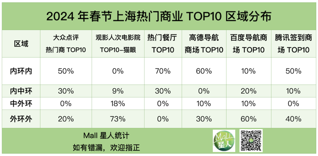 Mall星人統(tǒng)計(jì)了大眾點(diǎn)評(píng)熱門上榜、高德導(dǎo)航等平臺(tái)TOP10商場(chǎng)的占比,發(fā)現(xiàn)除了觀影人次外(更就近本地消費(fèi)),內(nèi)環(huán)核心商圈的商場(chǎng)占比并未落入下風(fēng)。