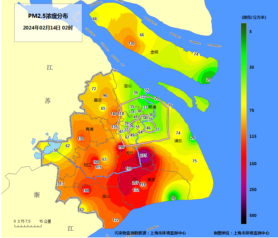 從PM2.5濃度分布看,受煙花爆竹燃放影響,2月14日1時(shí)起至4時(shí),外環(huán)外的PM2.5濃度顯著高于外環(huán)內(nèi)(外環(huán)內(nèi)禁放)。縱觀整個(gè)外環(huán)外可以放鞭炮的地方,全市小時(shí)濃度最高值出現(xiàn)在閔行浦江站點(diǎn)。也就是說(shuō),浦江鎮(zhèn)煙花放得最多最久、也最“燒錢”。
