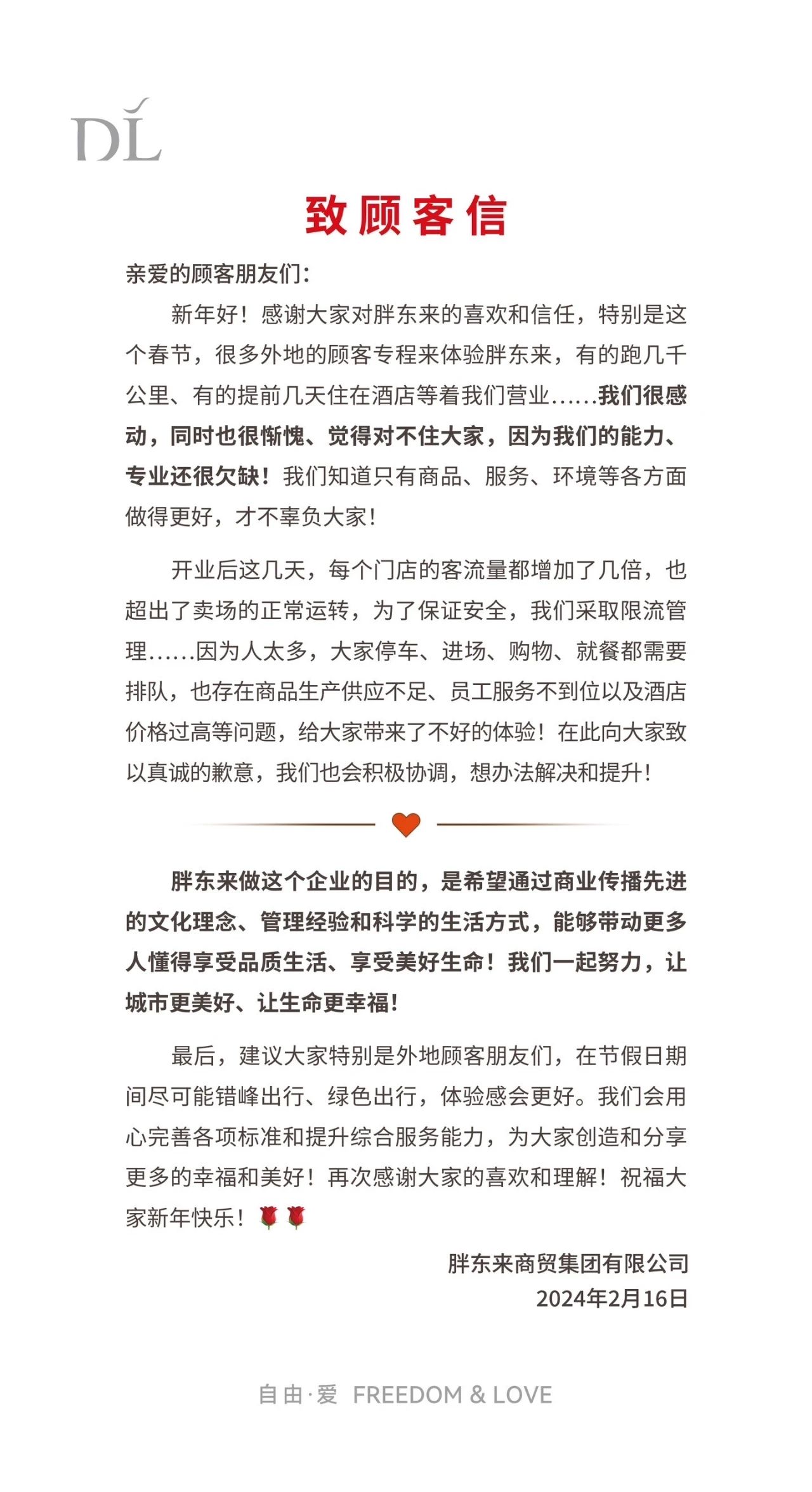 如潮的客流為胖東來帶來了新的挑戰(zhàn),這讓原本閑庭信步不緊不慢的胖東來陡然緊張起來,它怕慢待了顧客,怕顧客沒買到趁心的商品,怕員工太累,怕店內(nèi)設(shè)備設(shè)施超負(fù)荷運(yùn)轉(zhuǎn),怕顧客的吃住行花費(fèi)太高,也怕生意太好。胖東來“覺得對(duì)不住大家”專門發(fā)了一篇《致顧客信》,它說“我們一起努力,讓城市更美好,讓生命更幸福”。
