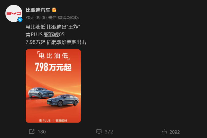 2月19日,比亞迪打出“王炸”,推出秦PLUS榮耀版和秦PLUS驅(qū)逐艦05,比亞迪出新車不奇怪,引發(fā)“行業(yè)地震”的是這兩款車型的價(jià)格,官方指導(dǎo)價(jià)都是7.98萬元起,同時(shí)還打出了“電比油低”的口號。值得一提的是,這并不是比亞迪第一次將王朝系列車型的價(jià)格下降到10萬元以內(nèi),此前,比亞迪也喊出了“油電同價(jià)”的口號,并且將秦PLUS DM-i冠軍版降到10萬元以內(nèi)。比亞迪降價(jià)取得的成績也是肉眼可見的,2023年秦PLUS累計(jì)銷量超45萬輛,第一次成為A級轎車市場年度銷量冠軍。而這次,比亞迪又一次瞄準(zhǔn)了10萬元以下的市場,口號也更進(jìn)一步。