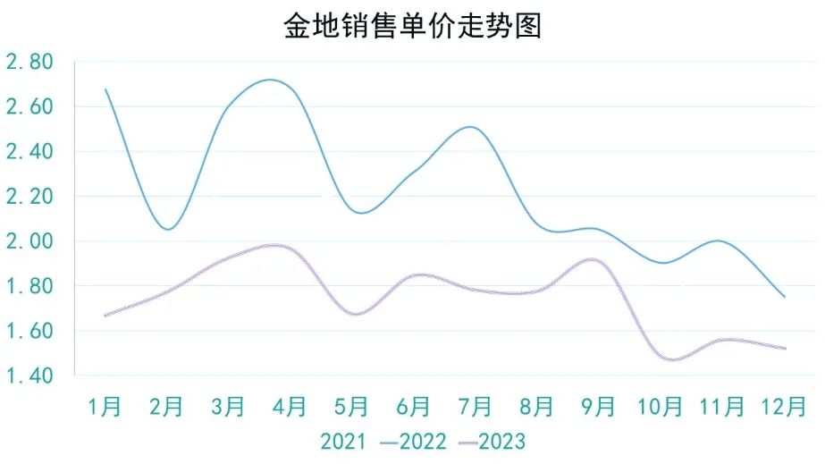 2023年對(duì)于房企來說,整體銷售均不及預(yù)期,金地的數(shù)據(jù)也為近三年低位,是2021年同期五成多一點(diǎn)。