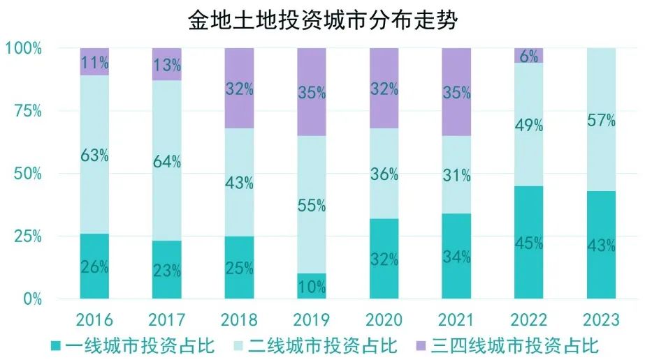 上圖可見,2018-2021年期間,金地每年總投資額3成以上投向三四線城市,到了2022年投資風(fēng)向轉(zhuǎn)變,2023年三四線城市無新增土儲(chǔ)。