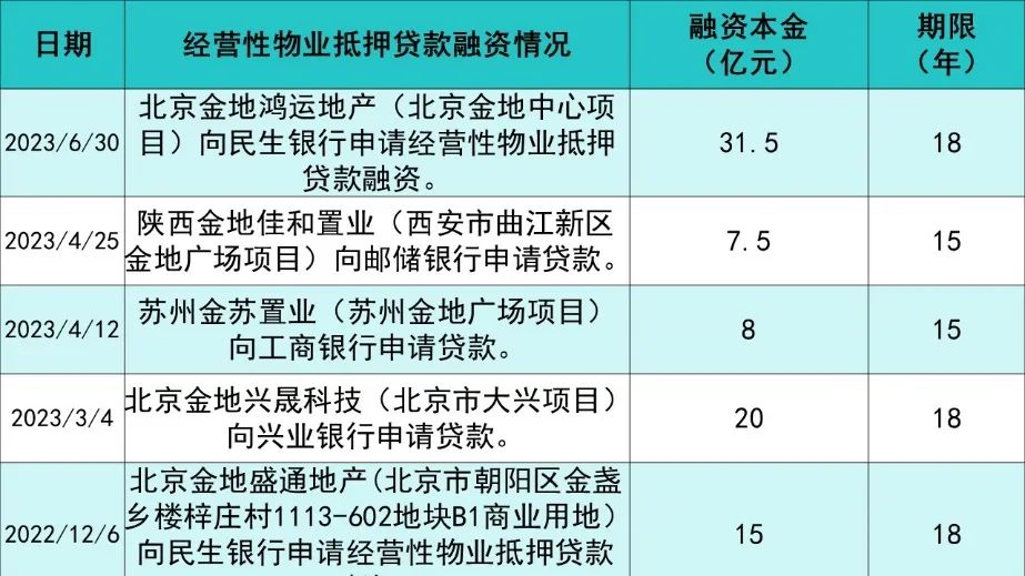 使用經(jīng)營(yíng)性物業(yè)抵押融資,也是金地的選擇之一,目前其融資規(guī)模累計(jì)達(dá)到82億元,期限最長(zhǎng)為15年以上。