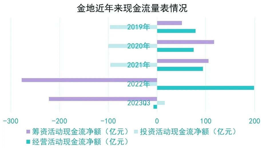 2019-2022財(cái)年,金地均保持年年都有籌資活動(dòng)凈流入,但近兩年由于積極的償債動(dòng)作,每年都有超過200億元的凈流出。