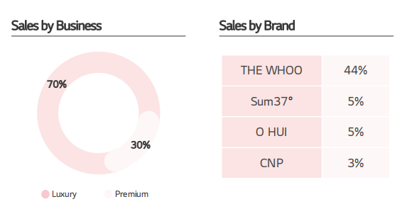 就品牌表現(xiàn)來看,THE WHOO(后)貢獻(xiàn)了最大營業(yè)收入,占比達(dá)44%,其次為蘇秘37°占比5%、O HUI(歐蕙)占比5%、CNP占比3%?梢,從品牌銷量結(jié)構(gòu)上來看,LG生活健康依然比較依賴于THE WHOO(后)這一單個品牌。
