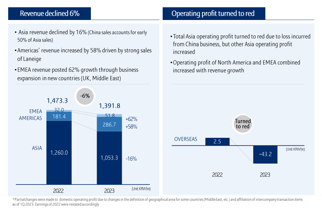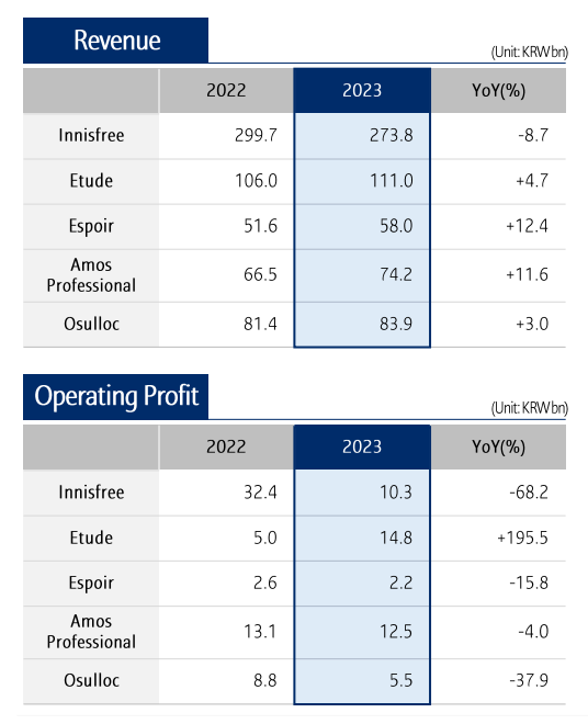 其最新公布的2023年第四季度業(yè)績情況不太樂觀,該季度集團銷售額和凈利潤分別下降13.3%、57.6%,美妝業(yè)務(wù)同樣慘淡,該季度銷售額同比下降23.7%至6640億韓元,營業(yè)利潤同比下降90.8%至70億韓元,跌幅超90%。