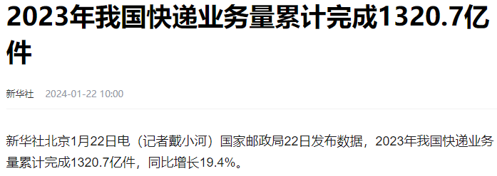 1月22日,國家郵政局發(fā)布數(shù)據(jù),2023年我國快遞業(yè)務量累計完成1320.7億件,同比增長19.4%。雖然相較于2022年的個位數(shù)增長有所回彈,但對比前幾年超過30%的業(yè)務增速已經(jīng)稍顯疲軟。