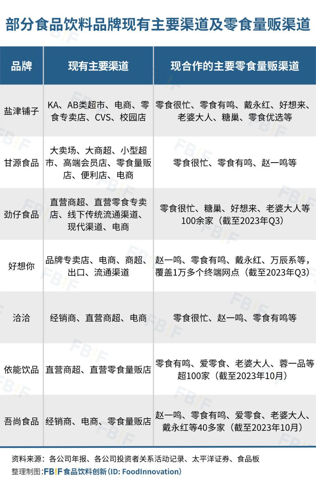 但品牌并沒有鎖定于這幾家頭部企業(yè),而是持續(xù)增加合作的渠道數(shù)量。以勁仔食品為例,2023年Q1、Q2到Q3,其合作的零食量販渠道從40余家、70余家增至100多家[7][3][12]。2023年全年目標則是對門店在500家以上的零食量販系統(tǒng)實現(xiàn)全覆蓋[2]。
