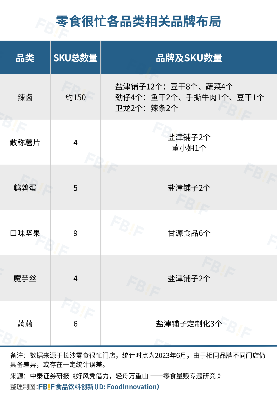在此方面,鹽津鋪子是相對強勢的品牌。鹽津鋪子橫跨辣鹵、深海零食、烘焙、薯片、蒟蒻、果干等細分品類。以零食很忙為例,鹽津鋪子與其合作的SKU數(shù)量超過50個[2]。而且鹽津鋪子在零食很忙各品類中占比也不小。中泰證券2023年6月的一份研報顯示,零食很忙辣鹵品類的150個SKU中,鹽津鋪子占了12個;散稱薯片的4個SKU中,鹽津鋪子占了2個。