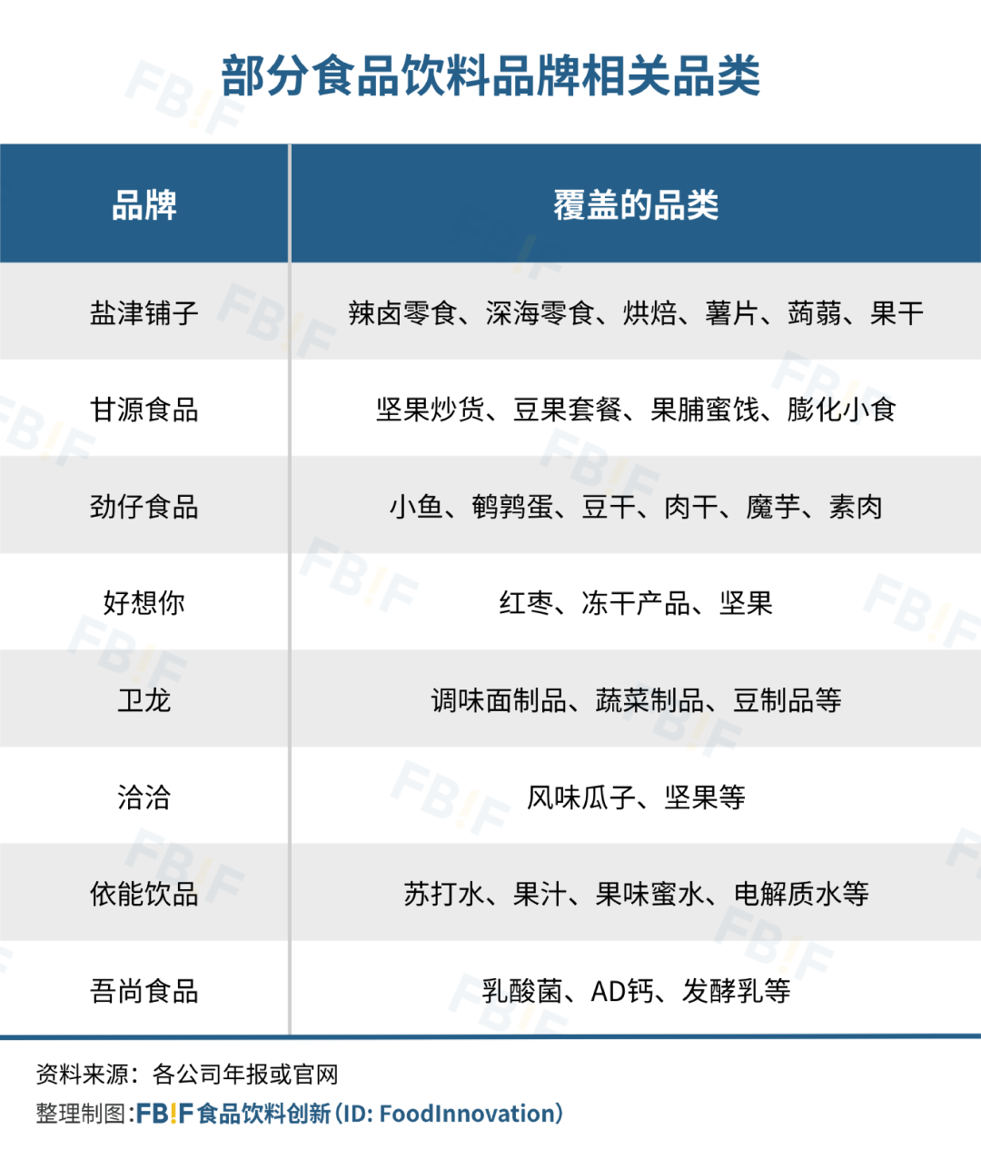 FBIF梳理各品牌的產(chǎn)品矩陣發(fā)現(xiàn),入駐零食渠道的品牌大多不走單一SKU或大單品路線,而是覆蓋多個細分品類。