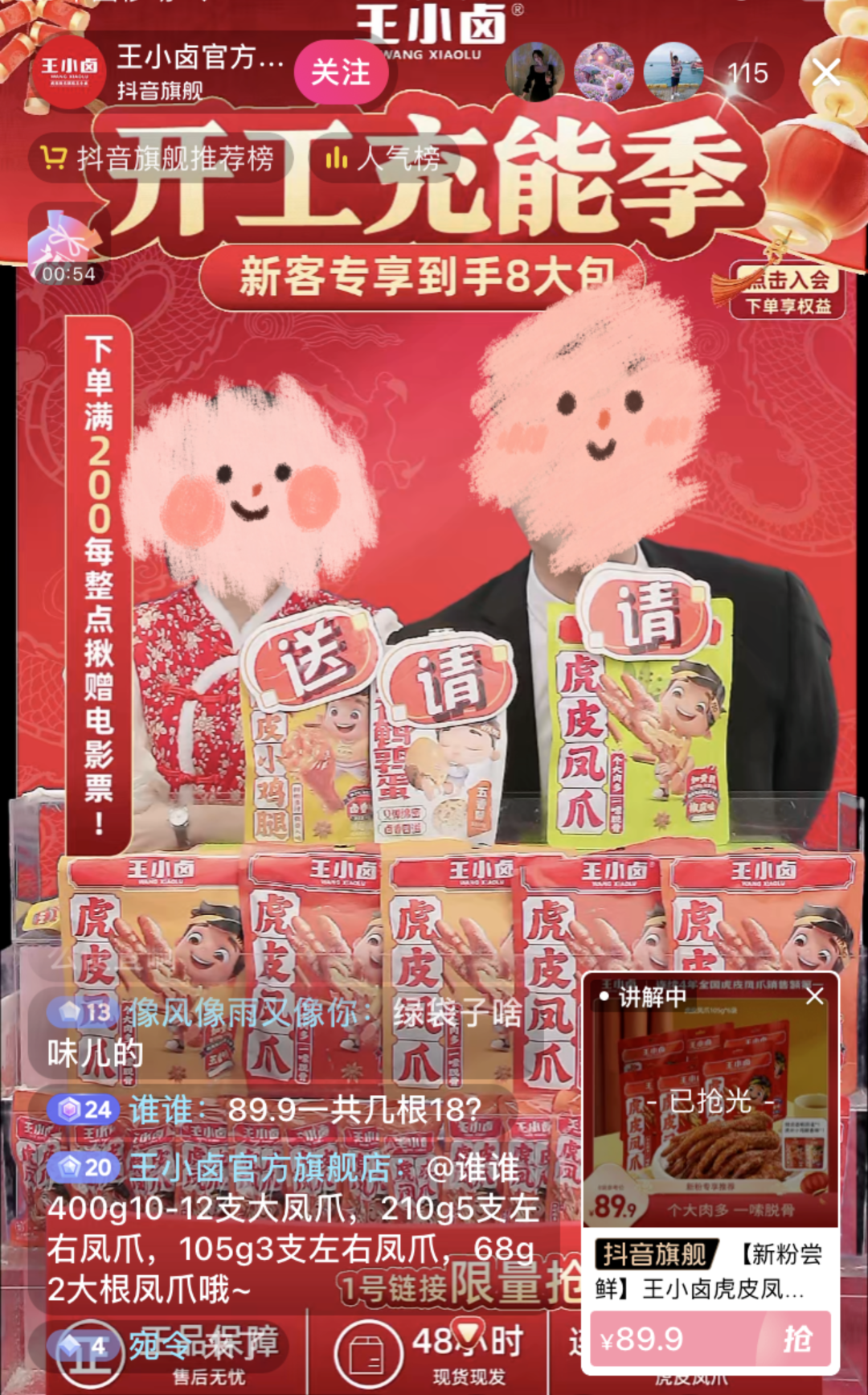 “抖系品牌”王小鹵,則是2021年開始重押處于流量紅利期的抖音。在抖音站內(nèi),王小鹵覆蓋了大部分美食類KOL,并利用巨量引擎通過信息流、短視頻和直播反復觸達核心人群(年輕女性),再將內(nèi)容流量導入抖店。一套組合拳,打爆了虎皮鳳爪這一大單品。加上此前在站外通過李佳琦直播間積累的品牌勢能,以及植入爆款熱劇、頻繁聯(lián)名等動作,王小鹵成為“鳳爪專家”[23]。2023年“618”大促期間,據(jù)王小鹵發(fā)布的戰(zhàn)報顯示,其在抖音位居休閑零食大類銷售榜TOP3,GMV同比增長30%。