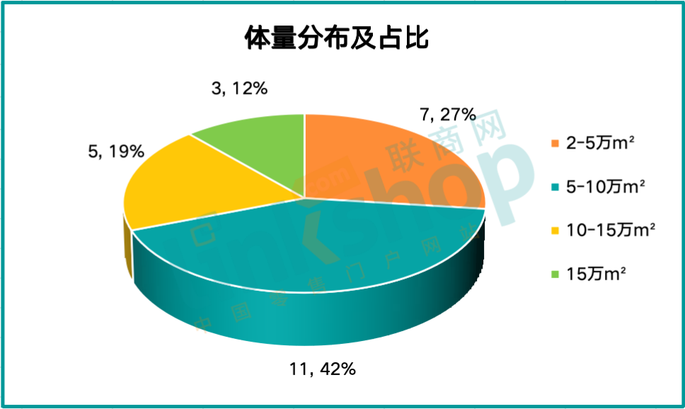 從新開商業(yè)項(xiàng)目體量來看,規(guī)模在5-10萬m²(含5萬m²,不含10萬m²)開業(yè)數(shù)量最多,占比42%;規(guī)模在2-5萬m²(含2萬m²,不含5萬m²)開業(yè)數(shù)量位列第二,占比27%;規(guī)模在10-15萬m²(含10萬m²,不含15萬m²)占比19%;15萬m²以上(含15萬m²)占比12%。