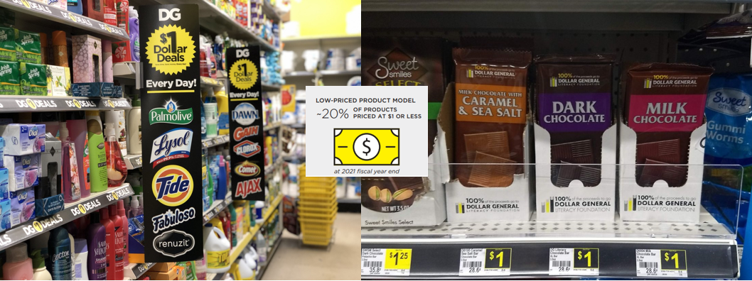 Dollar General是美國最大的美元店,被視為”經(jīng)濟越下行,生意越好“的典范,曾經(jīng)實現(xiàn)了連續(xù)30余年的同店銷售增長——跨越了2000年初互聯(lián)網(wǎng)泡沫、2008年的次貸危機、2019年的新冠疫情,直到目前依然有超過2,000種商品價格在1美元及以下。
